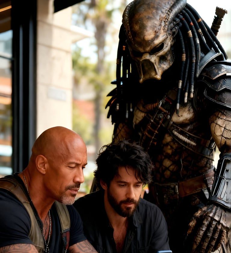 Buatkan generasi AI fotorealistis the rock sebagai Dutch Schaefer dari film Predator, yang sedang duduk di meja kafe bersama seorang pria (gunakan wajah pria yang 1000,99% sama seperti foto yang diunggah), serta karakter Predator berukuran besar berdiri di samping mereka. Ketiganya menatap layar ponsel pintar dengan sangat fokus. Gunakan cahaya alami, latar kafe outdoor, pencahayaan sinematik, detail tinggi, resolusi 8K.”.dalam gaya Film, Asli.dalam gaya Film, dengan rasio aspek 9:16