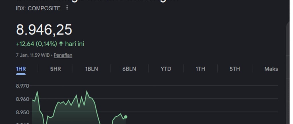 Dalam riset terbarunya, Ratih mencatat IHSG pada perdagangan sebelumnya menguat 0,84% atau naik 74,41 poin ke level 8.946. Namun, keterangan tersebut masih merujuk pada posisi waktu siang, sehingga belum terkonfirmasi apakah angka itu mencerminkan penutupan sesi I atau penutupan perdagangan harian secara penuh.
