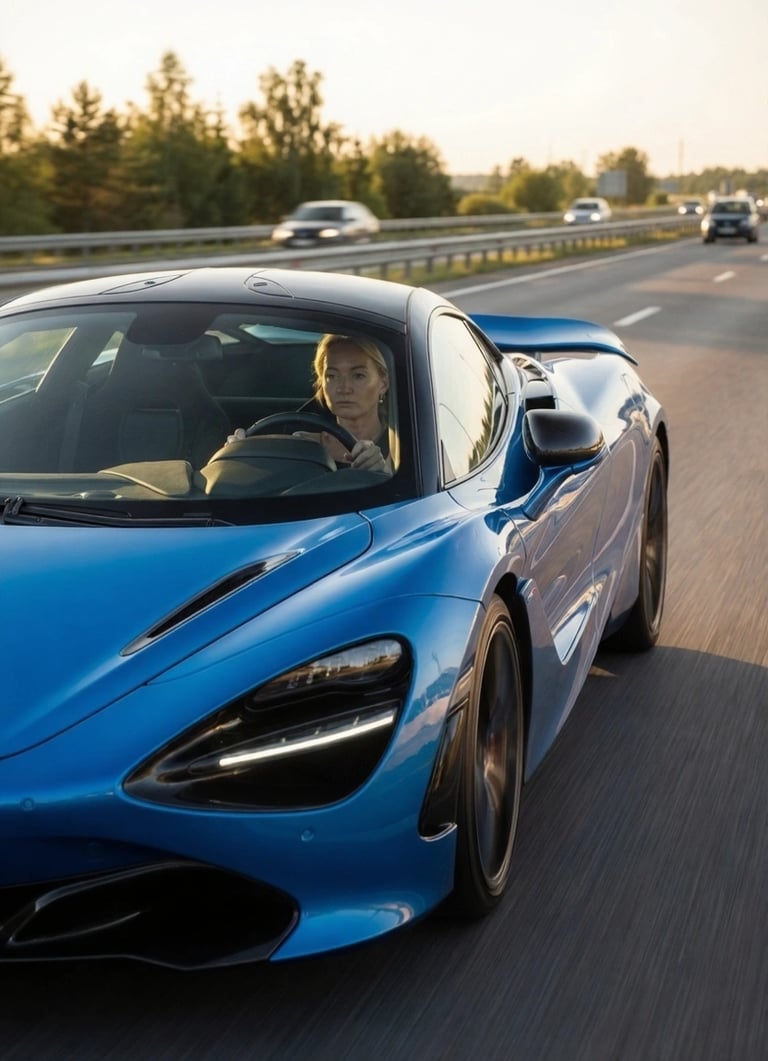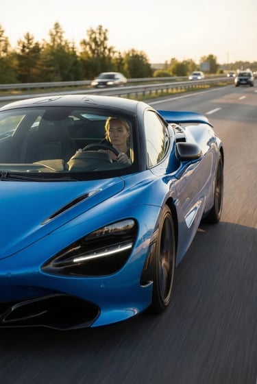 Rolling shot ultra-realistis, kamera rendah di depan kiri mobil, {SUPERCAR_MODEL} melaju cepat di highway, {REF_WAJAH_KAMU} terlihat jelas di balik kaca (bukan blur), golden hour sunlight, motion blur kuat pada jalan dan background, mobil tetap tajam, 24mm lens, cinematic, high contrast, realistic reflections, photoreal